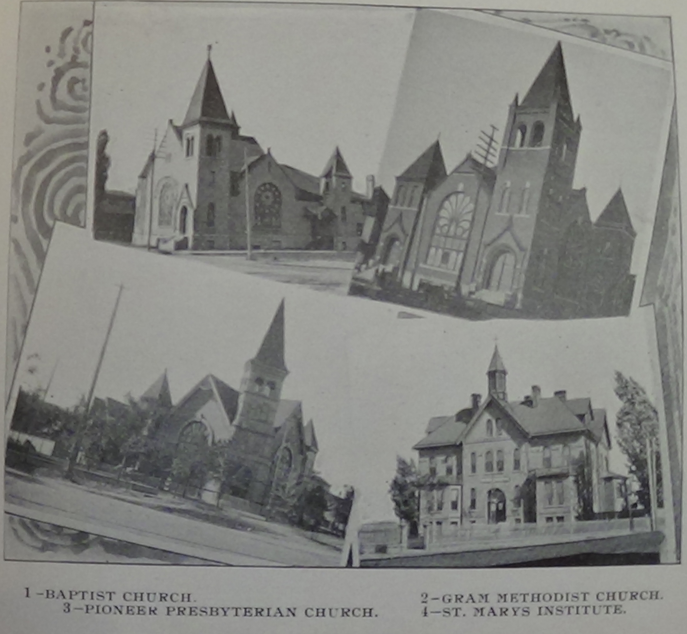 9 – Baptist Church, Gram Methodist Church, Pioneer Presbyterian Church, St. Mary’s Institute